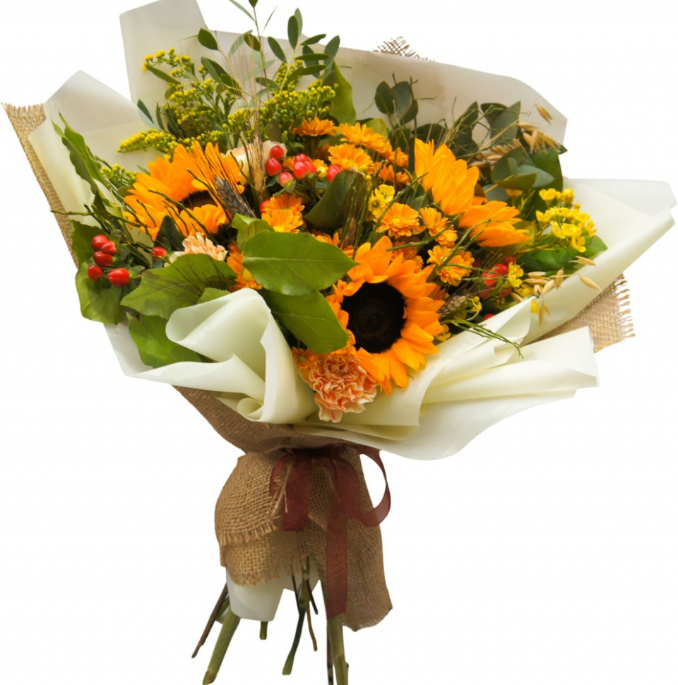1 подсолнух, 2 желтые ромашковые хризантемы, зелень, упаковка, лента2 подсолнуха, 2 желтые ромашковые хризантемы, зелень, упаковка, лента5 подсолнухов, 7 желтых ромашковых хризантем, зелень, упаковка, лента
